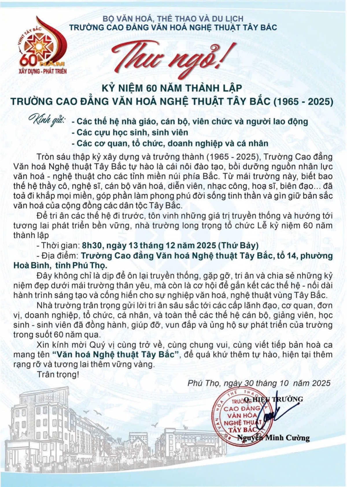 60 năm xây dựng và phát triển, vượt lên muôn vàn thử thách, Trường đã dần khẳng định vai trò là trung tâm đào tạo, sáng tạo và lan tỏa giá trị văn hóa nghệ thuật đặc thù của vùng Tây Bắc.